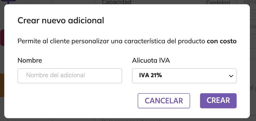 Al habilitar los adicionales del producto nos permite directamente seleccionar un adicional existente para agregarlo o crearlo con el botón CREAR NUEVO +