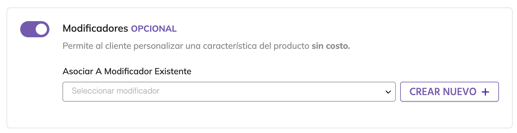 Para comenzar a agregar modificadores al producto se pueden seleccionar modificadores existentes del listado o se pueden crear nuevos presionando CREAR NUEVO +