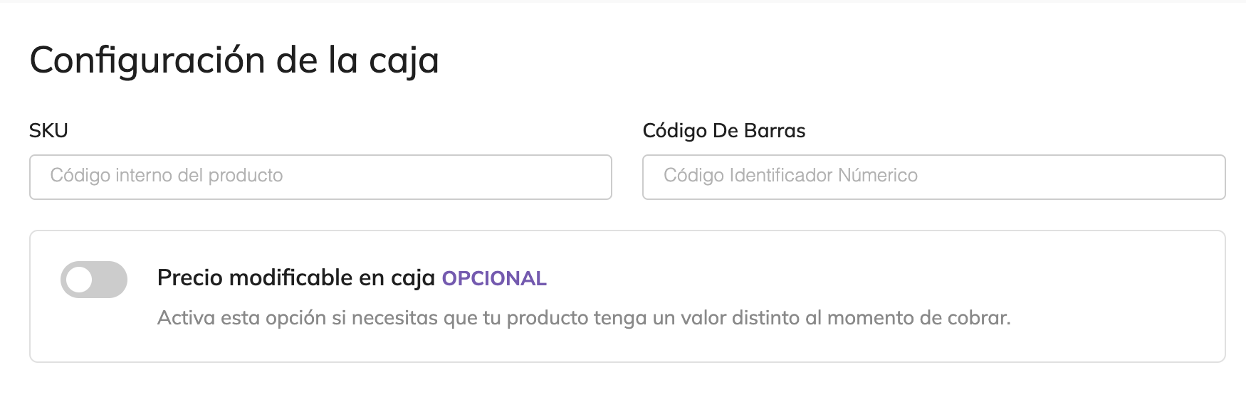 En esta sección vas a poder asignarle un código SKU al producto (un identificador común entre todos los sistemas que poseas, en caso de tener más de uno), el código de barras para utilizar escáners y elegir si el precio del producto puede ser modificable durante el fichado en la caja.