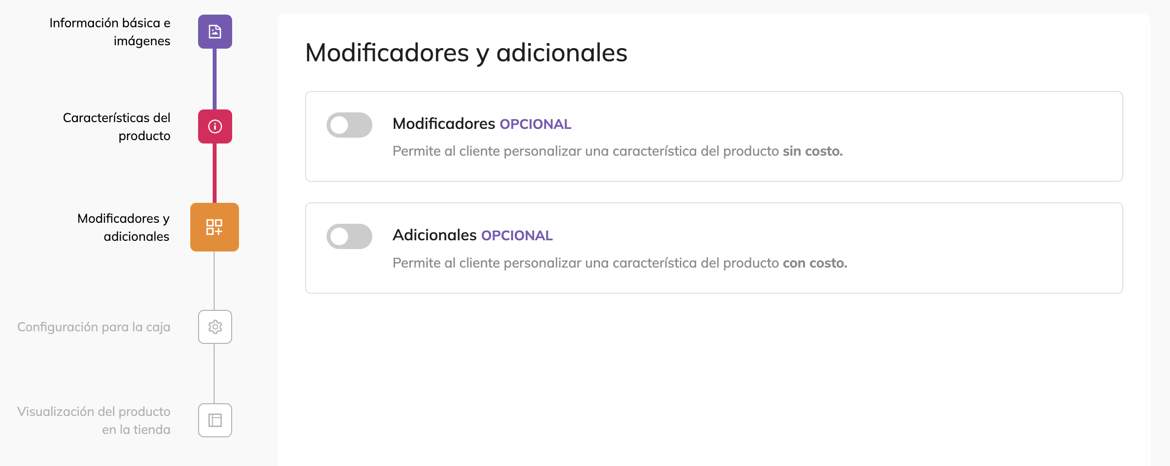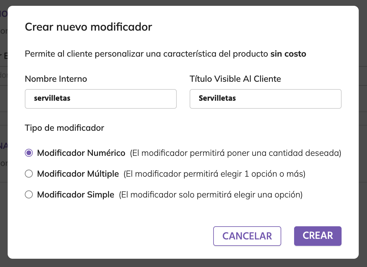La funcionalidad de crear modificador permite definir tanto un nombre de uso interno y el título del modificador que va a ser visible para los clientes.