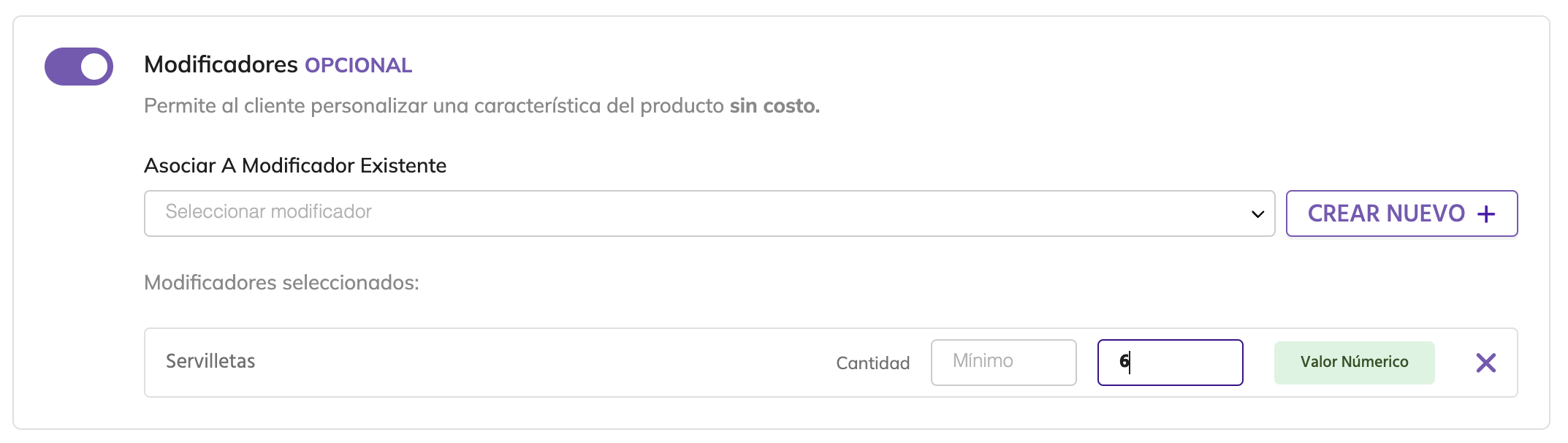 El primero es un modificador numérico. Para este vamos a crear uno llamado Servilletas que permita elegir cuantas va a querer nuestro cliente y vamos a establecer un máximo de 6