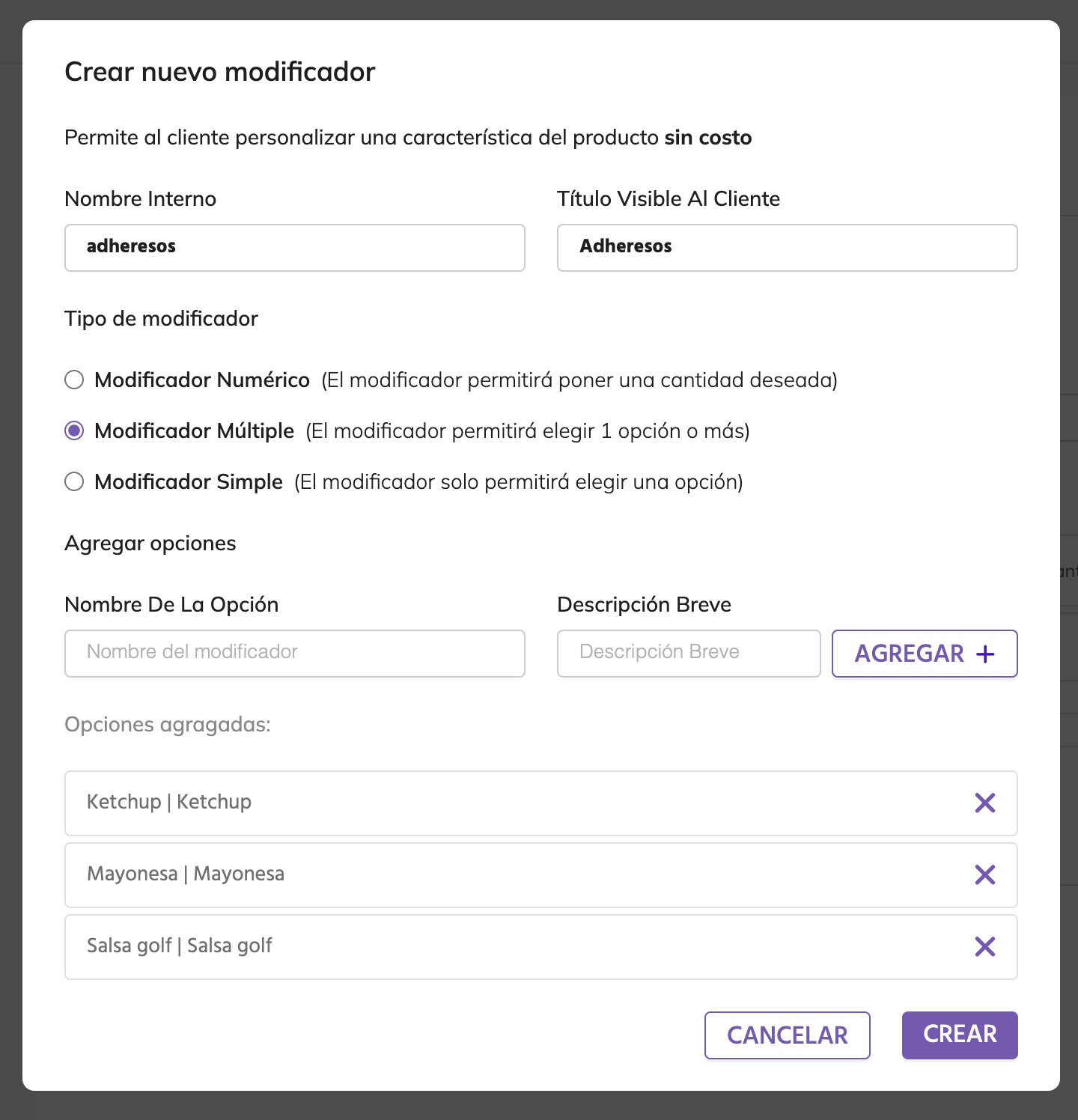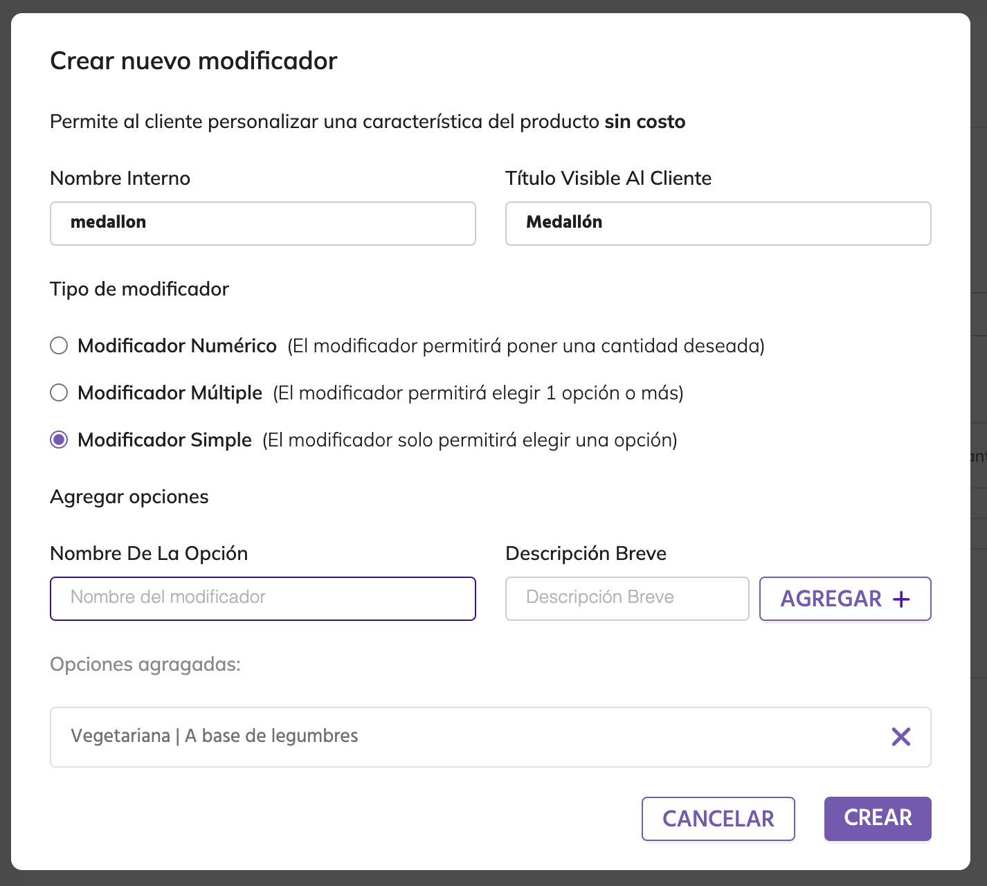 Para cada opción que queremos crear especificamos el nombre, una breve descripción para el cliente y la agregamos, una vez conformes se confirma la creación del modificador presionando CREAR