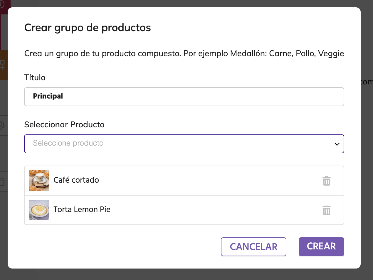 A medida que los productos se van seleccionando el área Seleccionar Producto, se van agregando al listado. Una vez conformes presionamos CREAR y confirmamos la creación del grupo