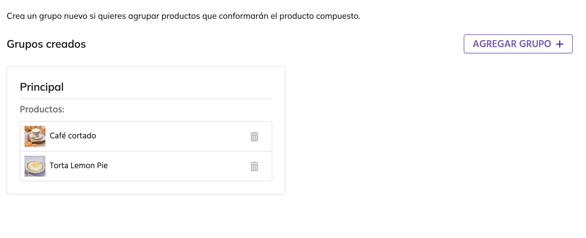 Para representar el primer ejemplo, vamos a generar un sólo grupo presionando AGREGAR GRUPO + , la idea va a ser armar un combo con un café y una Torta