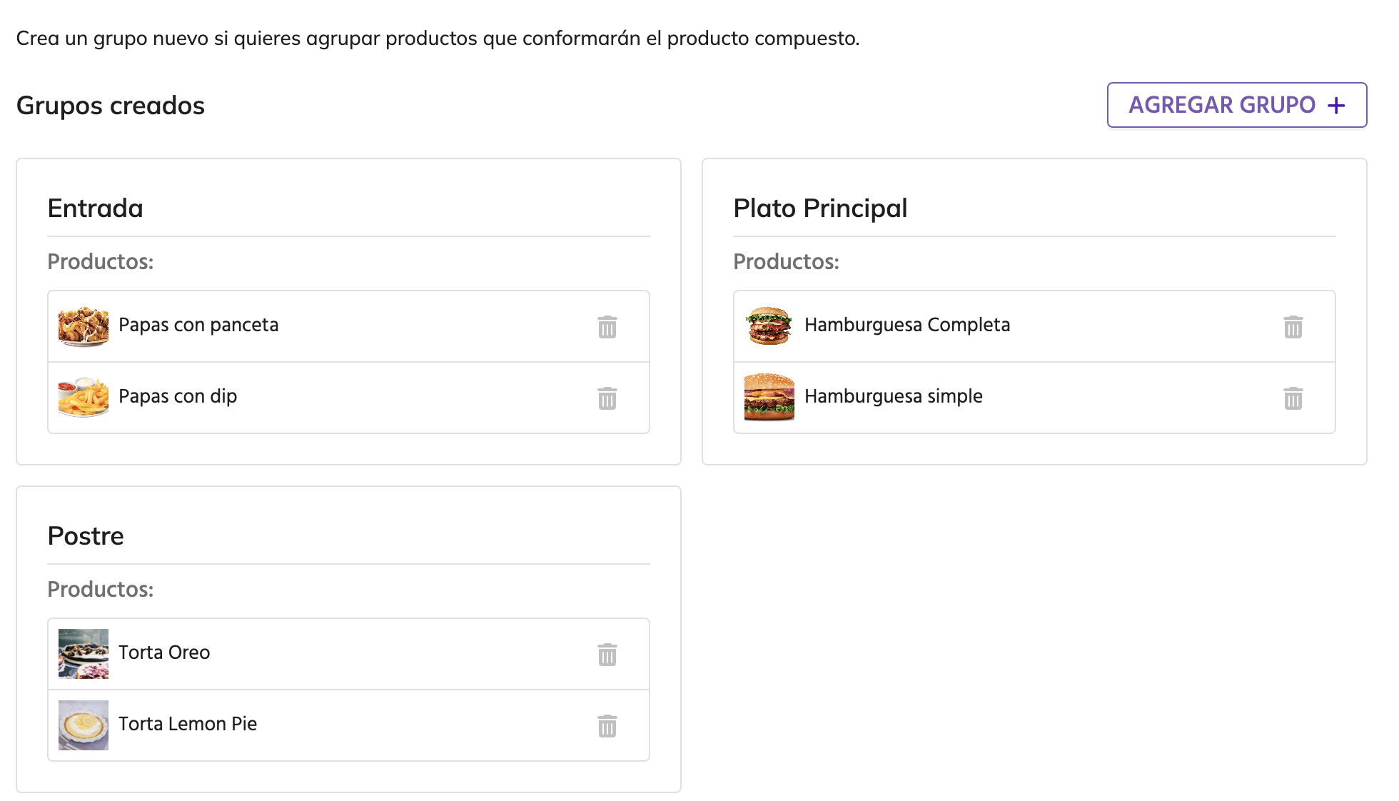 El camino para crear un producto compuesto es muy similar al proceso de crear un producto simple. La diferencia es que en vez de la sección Modificadores y adicionales, se cuenta con una sección Agrupación de productos donde se puede elegir los productos que lo componen