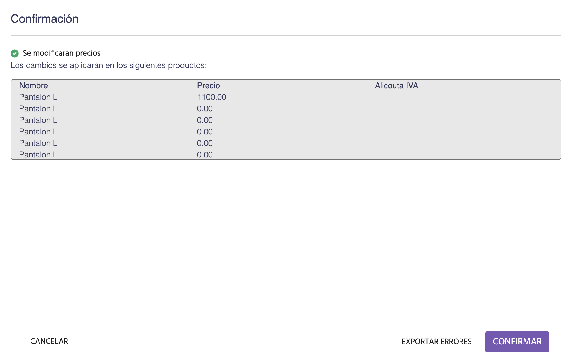 Una vez que estés seguro, presionando CONFIRMAR se concreta la actualización de la lista de precios