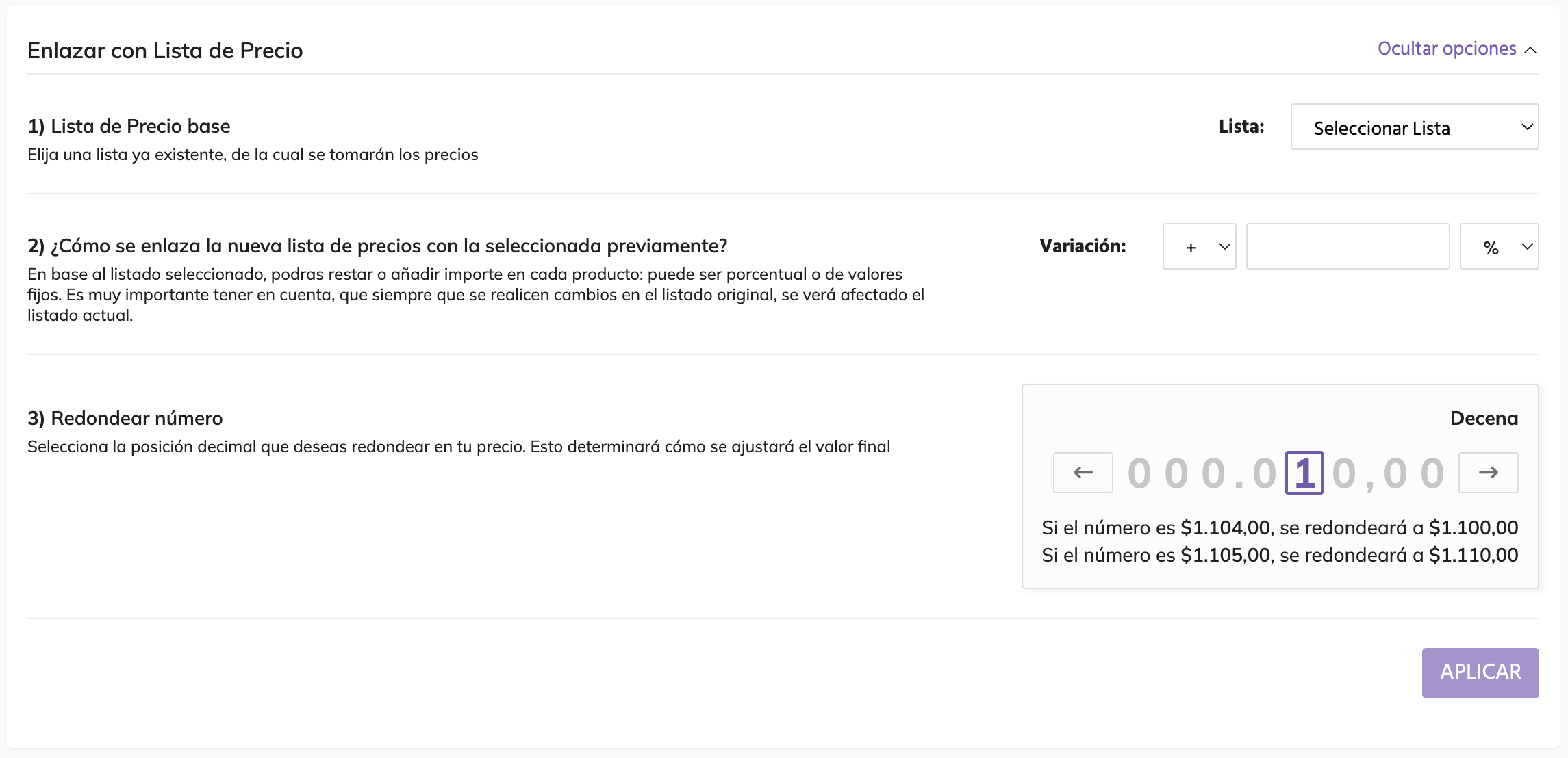 Si contás con varias listas y todas ellas tienen una lógica de precios que las conecta (EJ: lista minorista = lista mayorista + 15%), podes generar esa relación enlazándolas y podrás evitar tener que actualizar todas aquellas que queden enlazadas a la lista principal