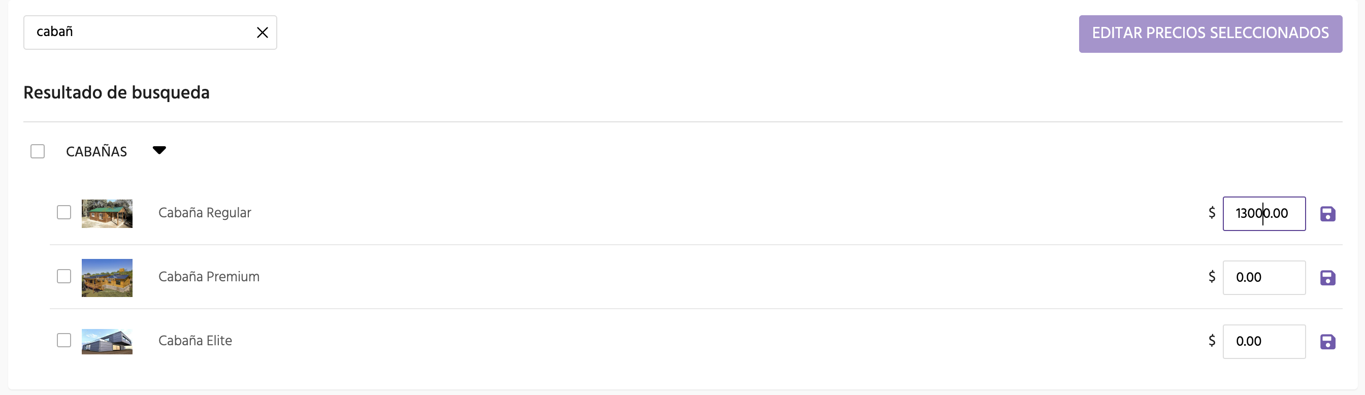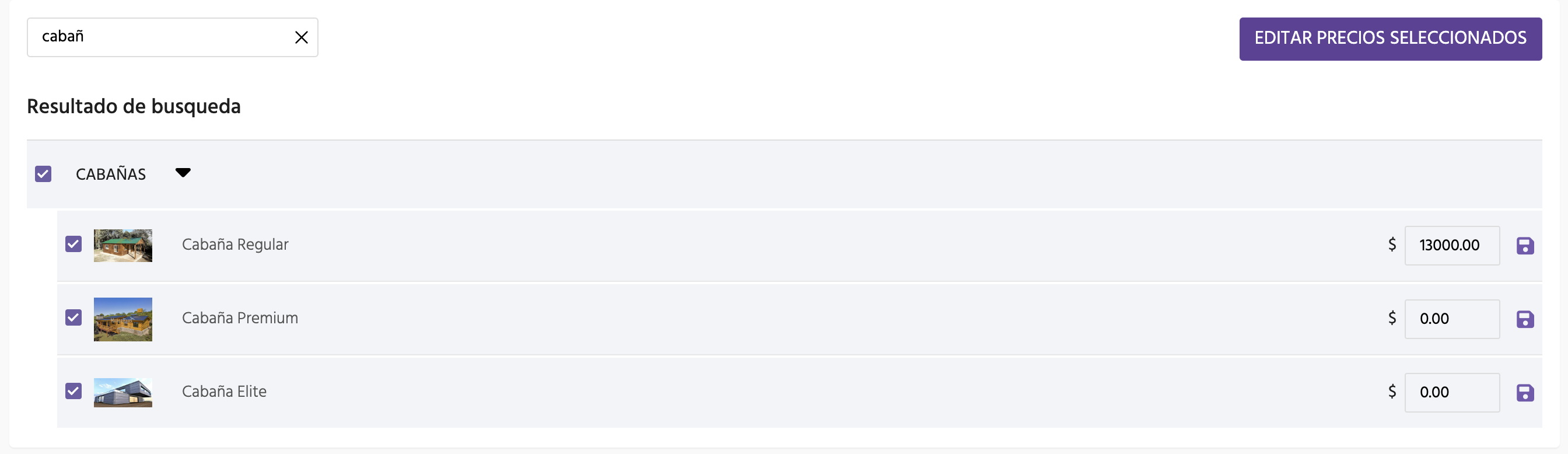 Los productos de muestran organizados por categorías, la forma más sencilla de encontrarlos es utilizar el buscador. Una vez que se encuentra la categoría o el producto, se muestra el precio a la derecha para que se pueda modificar y confirmar con el botón de guardado