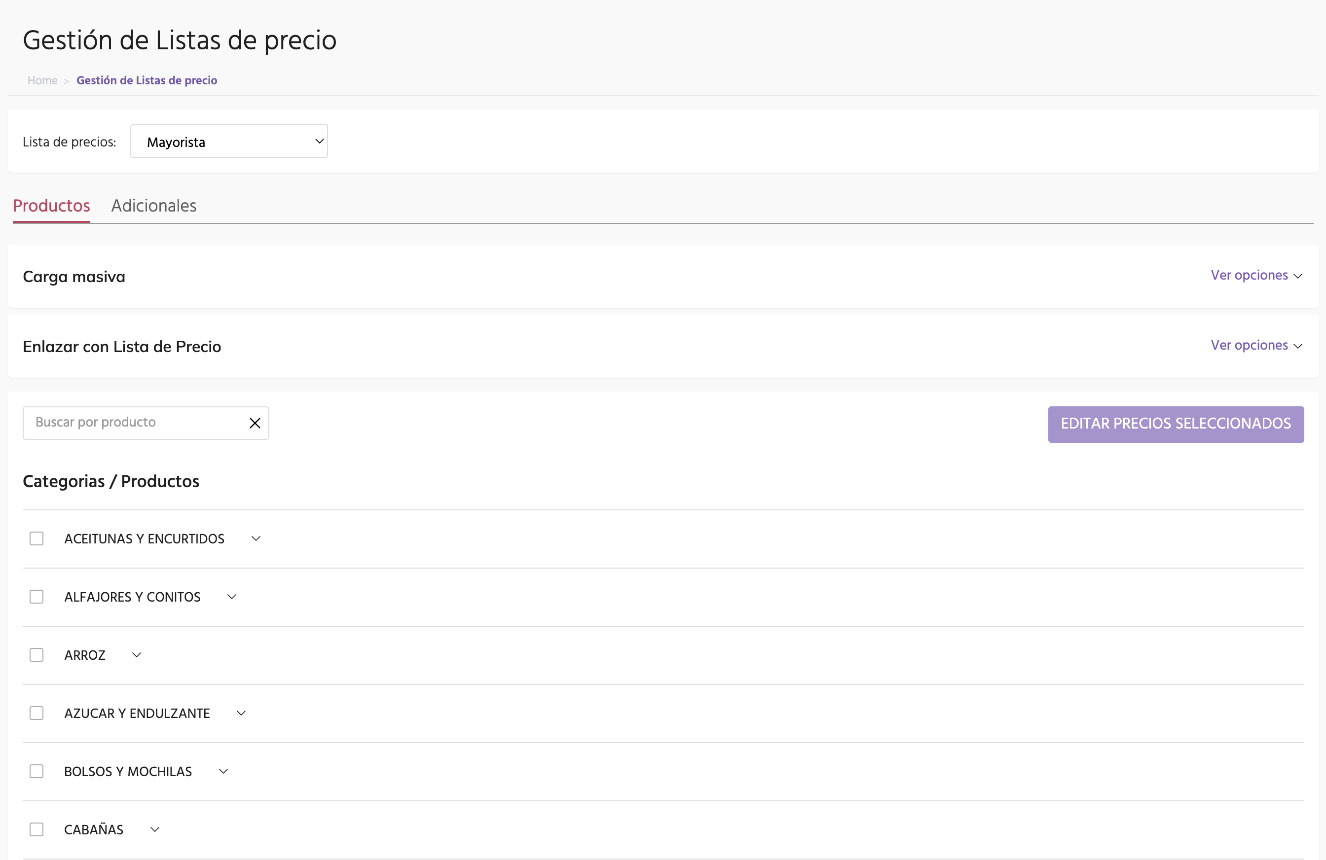 Una vez creadas se puede acceder a la gestión de precios de esa lista presionando sobre Gestionar lista o desde el menú en Precios → Gestión de precios
