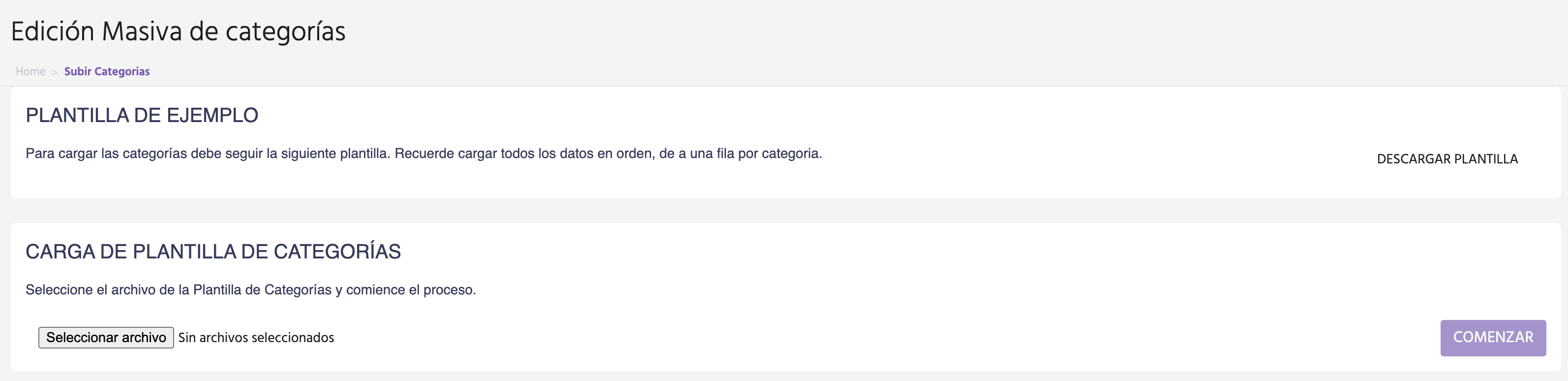 Para agregar categorías, en vez de ingresar los datos uno por uno, se sube un archivo con la información y se crean todas en ese momento.