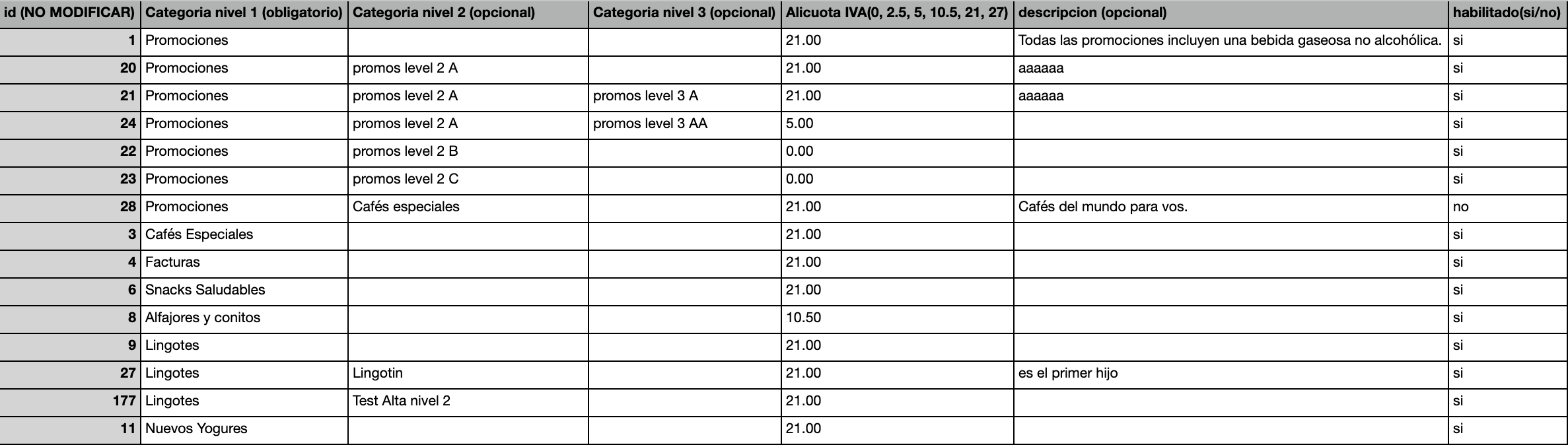 Importante: no debes modificar los datos en la columna id, de lo contrario se des asociarán los productos contenidos en la/s categoría/s